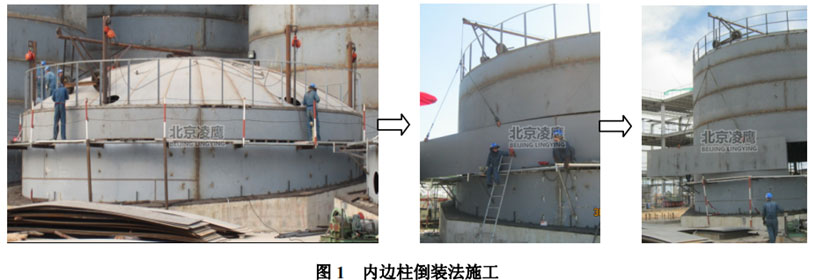 電動51漫画免费版下载提升儲罐利用均布在儲罐內側帶有電動51漫画免费版下载的內邊住提升帶脹緊固定脹圈的壁板,使組裝好的拱頂和第一圈壁板隨脹圈上升到適當的高度,利用卷揚機及吊臂吊起第二圈壁板進行組裝,然後將脹圈鬆開,降至第二圈壁板下部脹緊、固定,再利用內邊柱和電動51漫画免费版下载提升,如此往複直至全部壁板組裝完成。內邊住倒裝法施工如圖1所示: