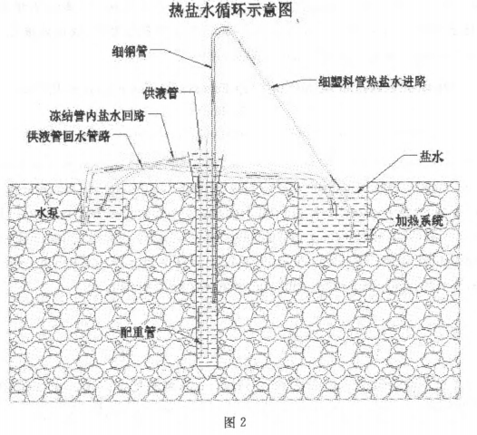 (3)利用潛水泵往細鋼管內打熱水循環,直至留出5米落至凍結管管口處,繼續接鋼管反複衝結晶固體,直至鋼管落到孔底。